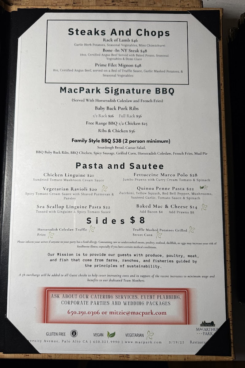 Organic Field Greens with Tomatoes, Cucumbers, Mushrooms, Croutons and Italian Vinaigrette Caesar Salad with Romaine, Garlic Croutons, Parmesan, Anchovy and Classic Caesar Dressing Spinach Ravioli with Tomatoes, Basil Marinara & Parmesan Classic Chicken Marsala with Mushrooms Sicilian Style Pot Roast with Romano Sauce Roasted Garlic New Potatoes Fresh Seasonal Vegetables Focaccia Bread Tiramisu
